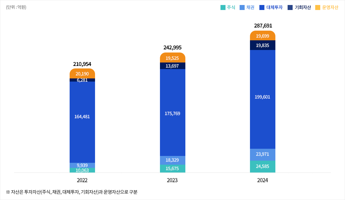 - 자산군은 투자자산과 운영자산으로 구분하며, 투자자산은 주식, 사모주식, 채권, 사모신용, 헤지펀드, 실물자산, 기회자산으로 구성되고, 운영자산은 회원대여, 기타자산으로 구성됩니다.