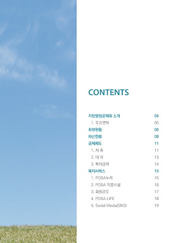 CONTENTS 지방행정공제회 소개 04 1. 주요연혁 05 회원현황 06 자산현황 08 공제제도 11 1. 저 축 11 2. 대 여 13 3. 복지급여 14 복지서비스 15 1. POBA누리 15 2. POBA 직영시설 16 3. 회원콘도 17 4. POBA LIFE 18 5. Social Media(SNS) 19